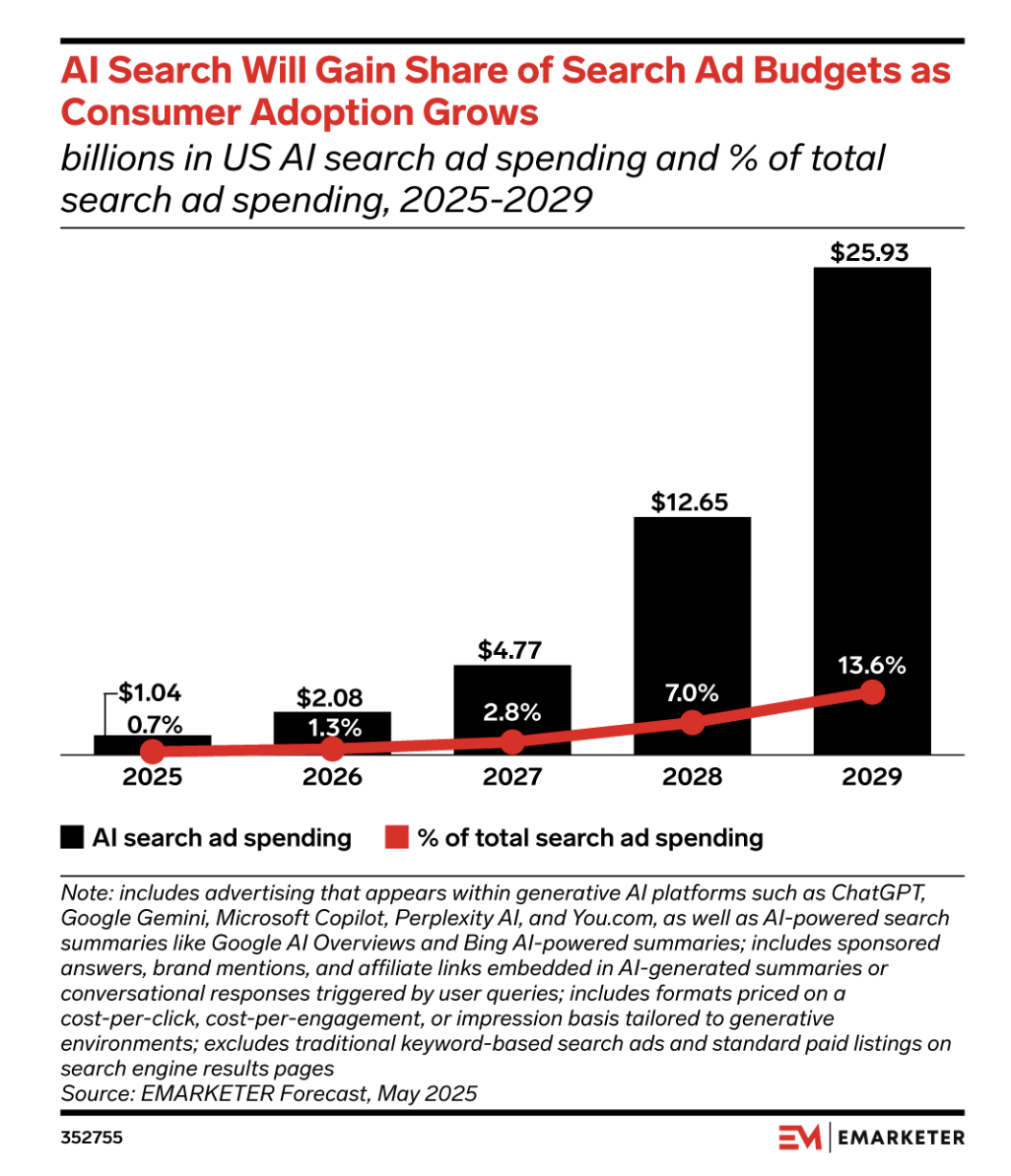According to eMarketer, US advertisers are projected to spend nearly $26 billion on AI search ads by 2029 - up from just over $1 billion in 2025. That’s a leap from 0.7% to 13.6% of total search ad budgets in only four years.