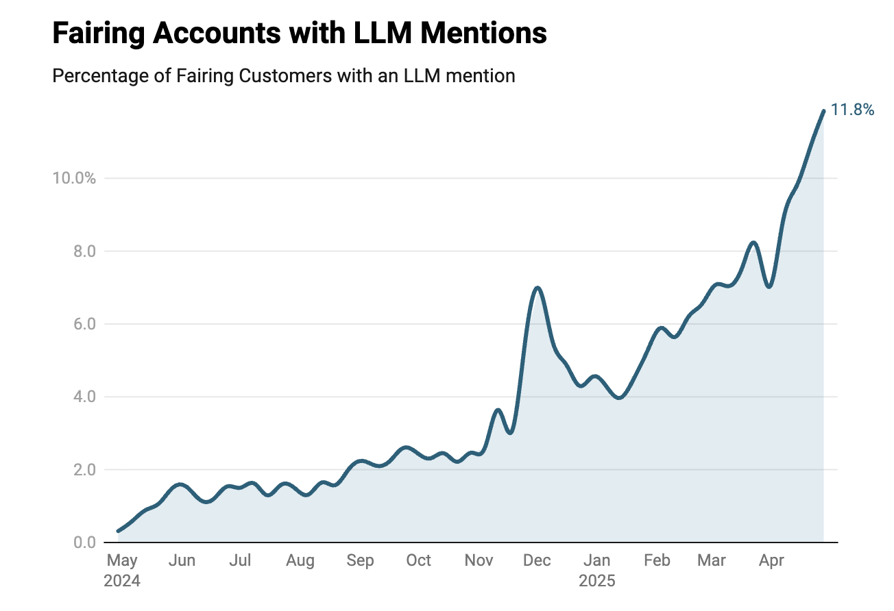 Data from Fairing’s attribution analytics dashboard shows a sharp rise in customers referencing ChatGPT or other LLMs when asked how they discovered a brand - jumping from near zero in mid-2024 to 11.8% by April 2025.