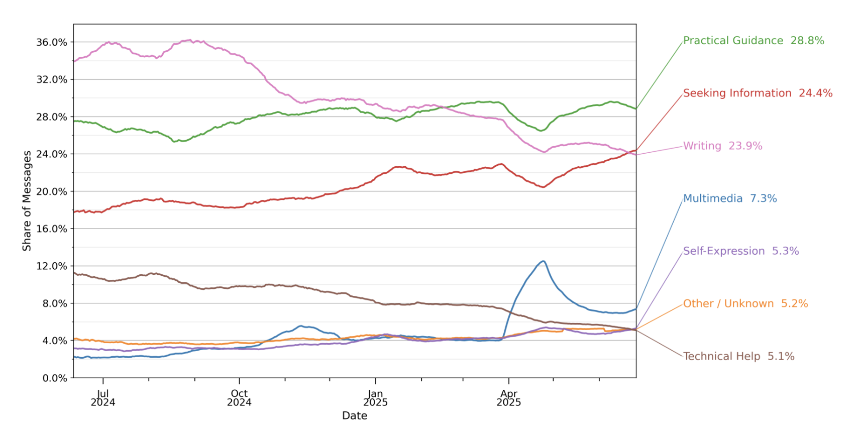 Over the past year, ‘seeking information’ has become one of ChatGPT’s fastest-growing use cases, rising steadily to account for 24.4% of all conversations. The trend suggests users are shifting from creative experimentation toward using AI as a search and discovery engine.