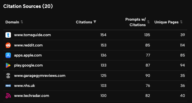 Screenshot from Obsero showing the most influential sources in the ‘get fit’ category. Interesting to see that Reddit has a much larger number of pages that are sourced, but tomsguide.com has far fewer, but is reference more often (just!).