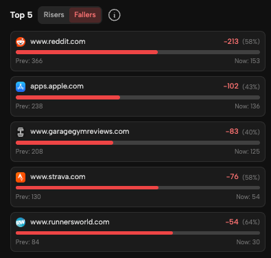 Likewise, brands can also see the biggest fallers that are declining in influence (note - Reddit is taking a tumble here):